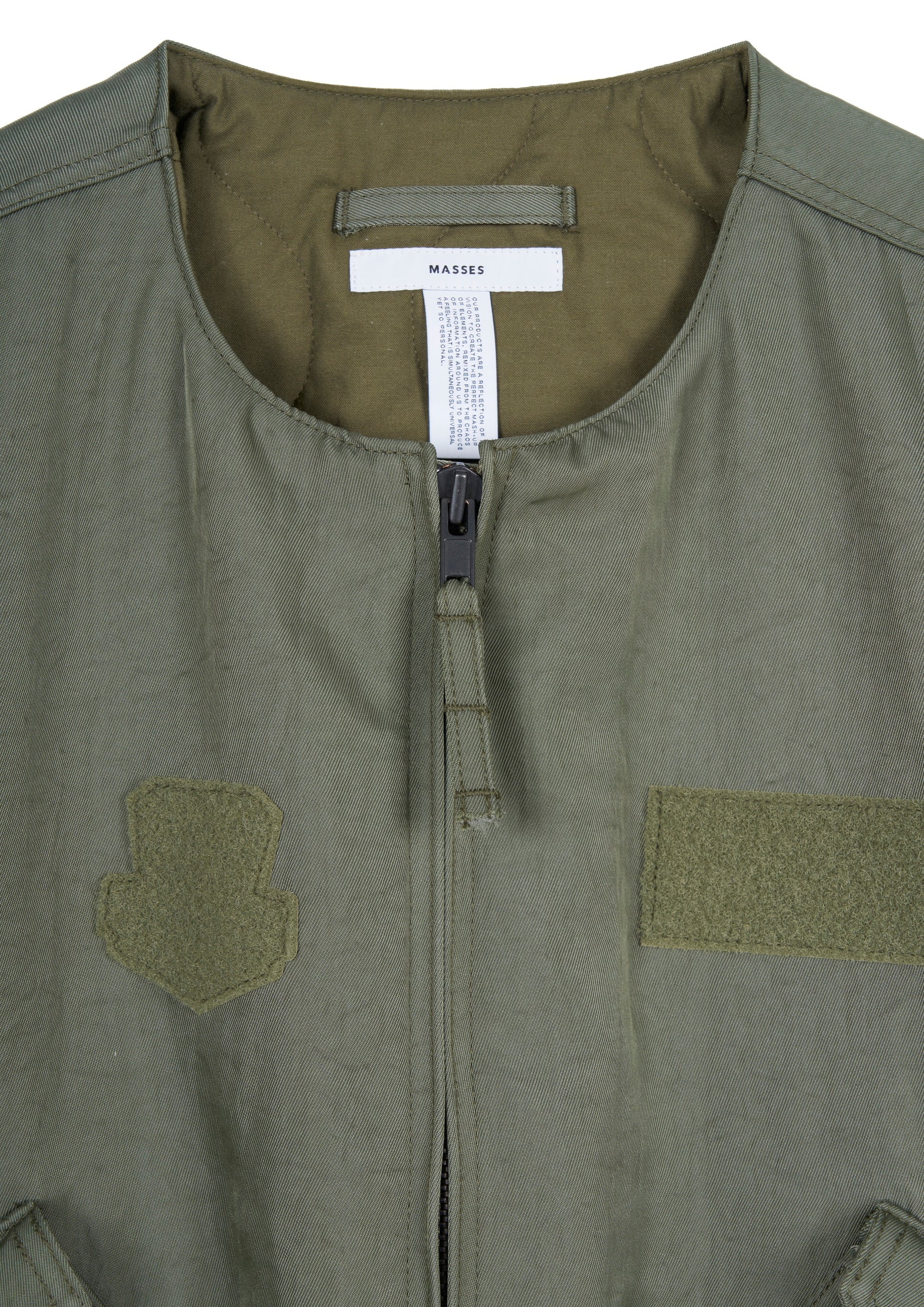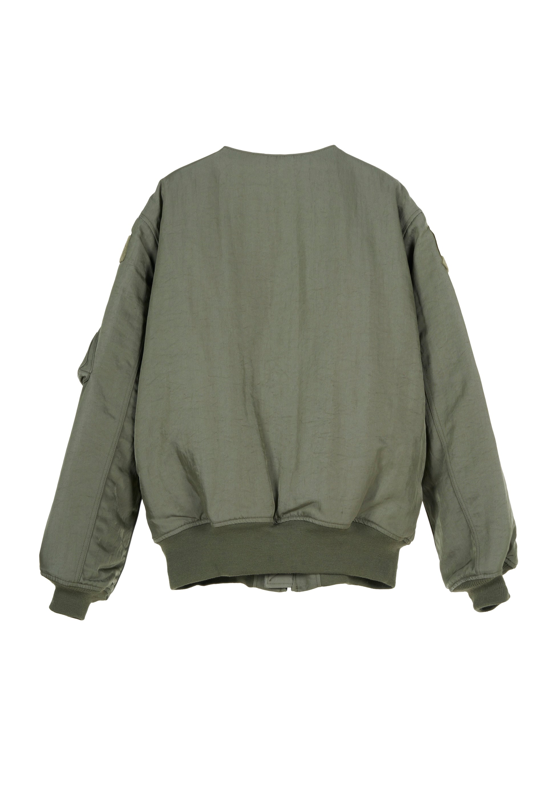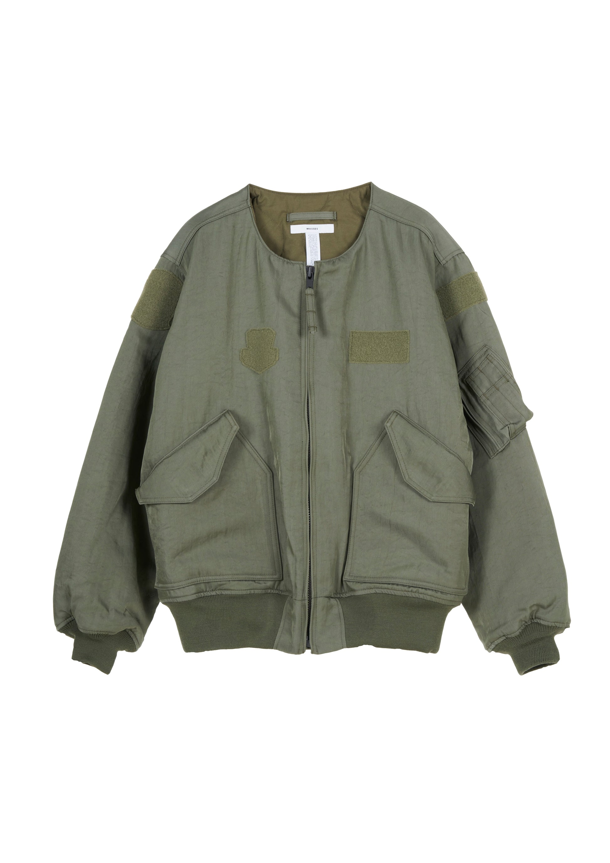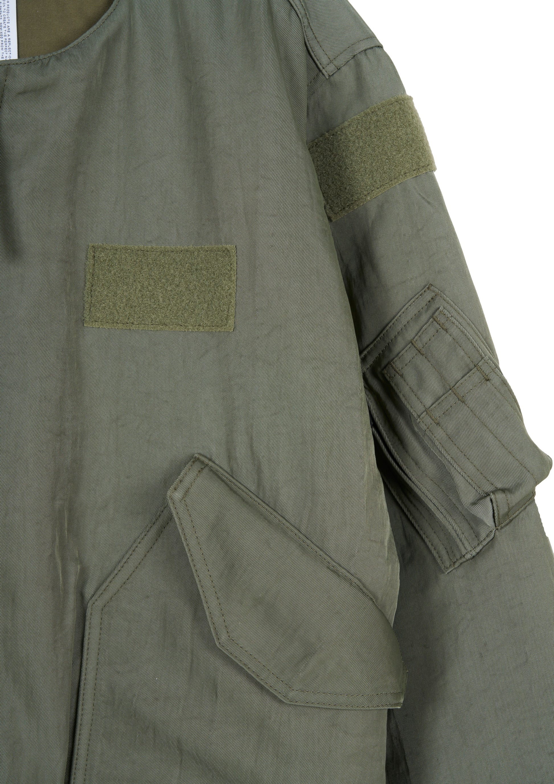 防寒性に特化した仕様となっており中綿の分量が多いCWUジャケット。襟部分をカットオフし、カラーレスデザインでモダンに仕上げた。両腰にフラップポケット、左腕にシガレットポケット、両胸・両腕にベルクロ留め仕様のワッペン台座が付属する。