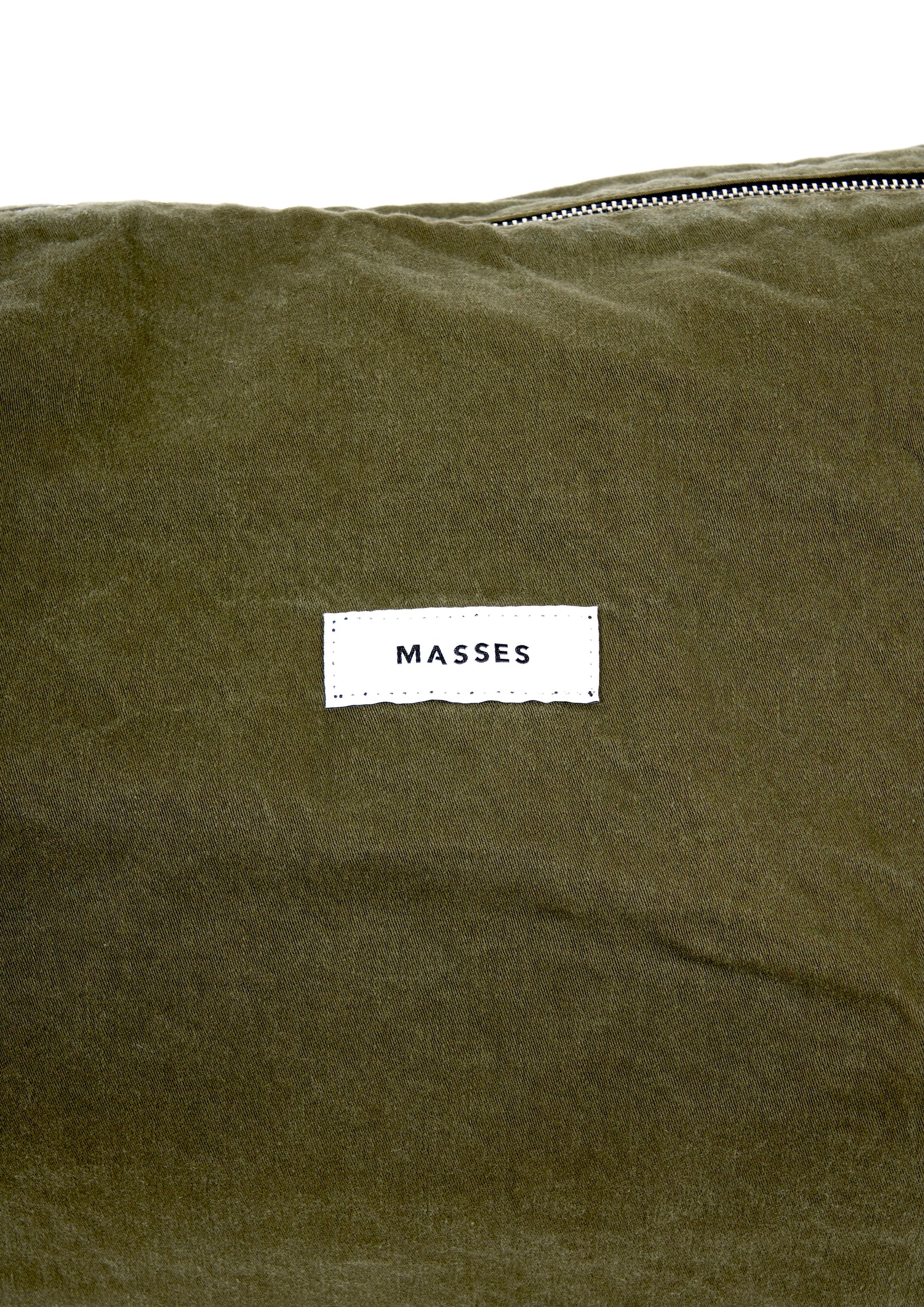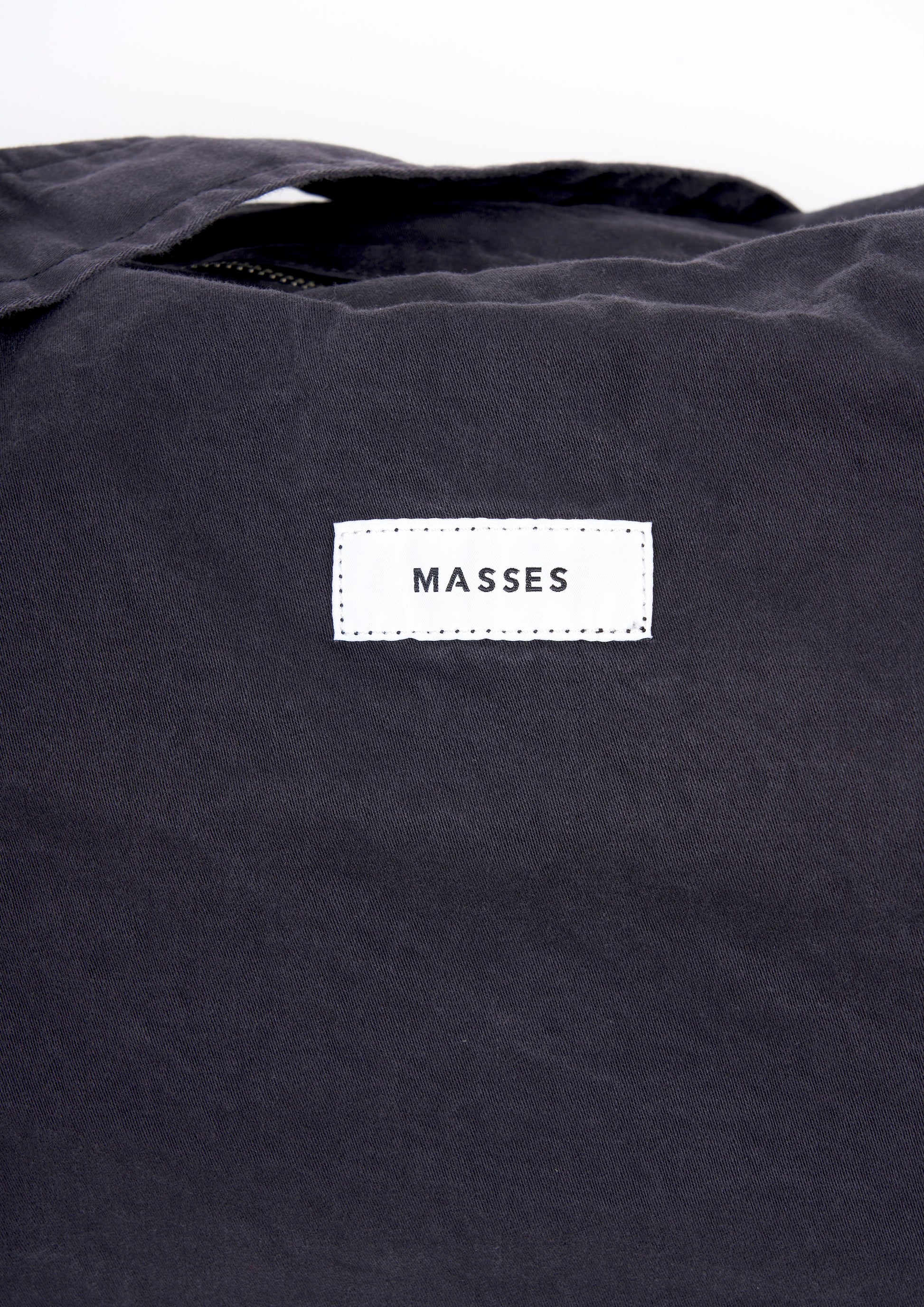 天面にファスナーが付く仕様のニュースペーパーバッグ。敢えてレターやグラフィックなどを入れずネームを叩いたのみのシンプルな仕様。スライダーの先端部分にレザーのストリングを付属。