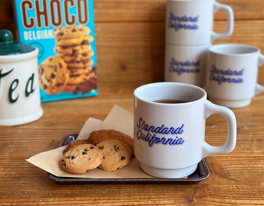 Standard Californiaオリジナルのマグカップです。ヴィンテージでも人気の高いマグカップの形をイメージし製作。場所を取らずに収納可能なスタッキングタイプのマグカップは、子レンジや食洗機にも対応しているので使い勝手は抜群です。サンフランシスコのハンドペイントサインの工房"New Bohemia Signs"で技を磨いた日本人のサインペインター、デザイナーが立ち上げた 「MODERN TWIST SIGNS」に制作を依頼したキャッチーなロゴがフロントに入ります。シンプルで飽きのこないデザインの日常使いに最適なマグカップです。
