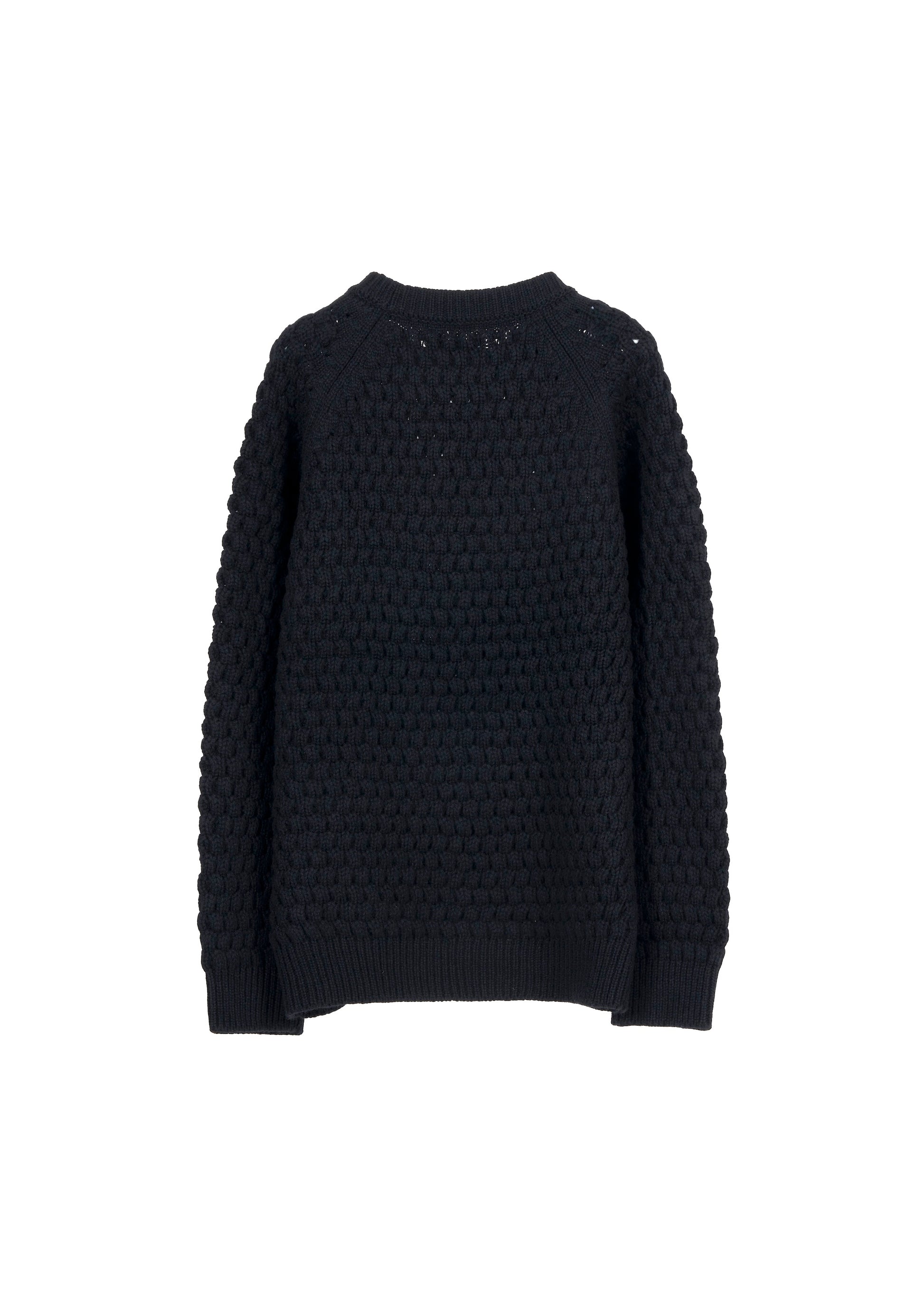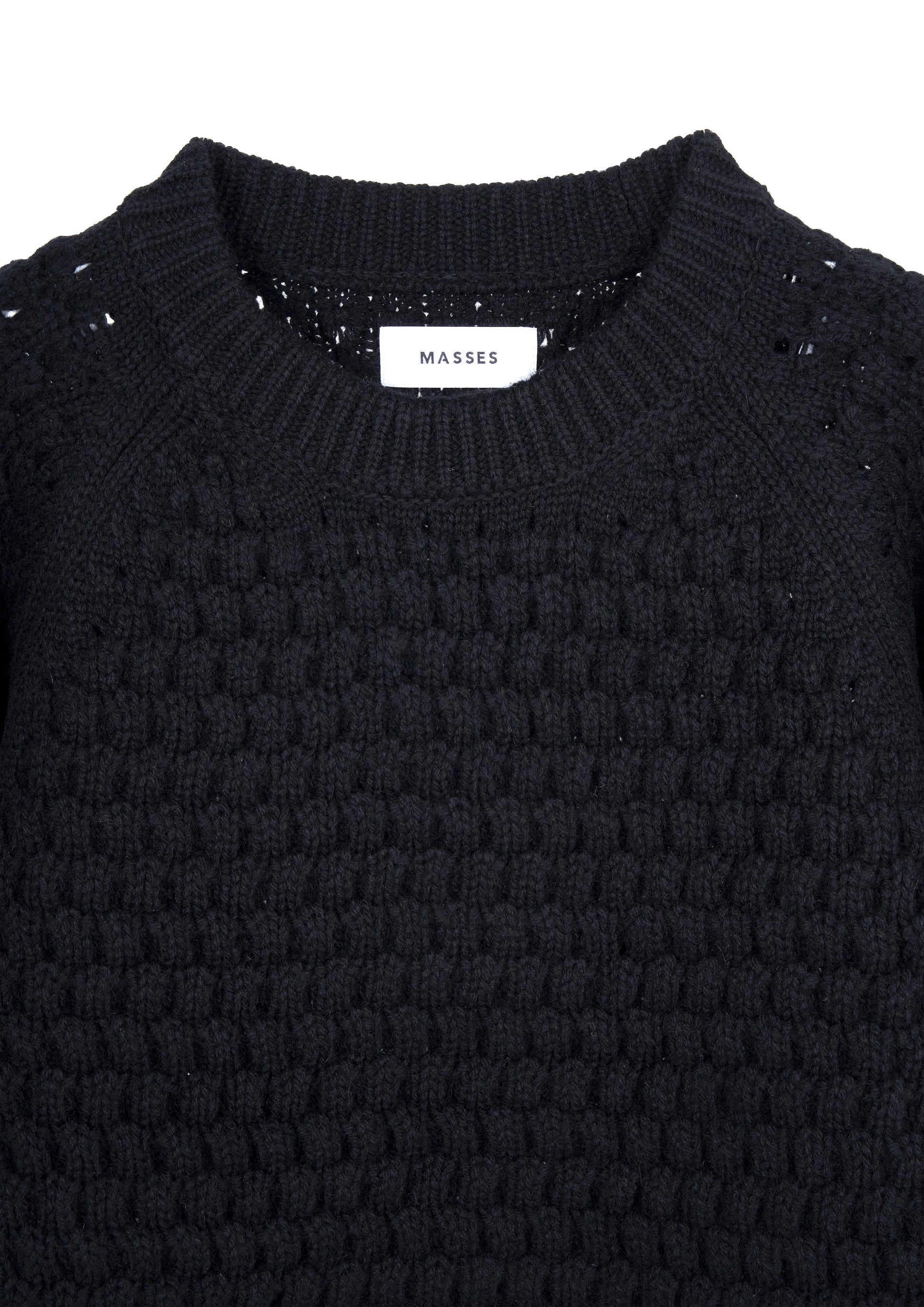 ヴィンテージの世界でフィッシャーマンニットとして知られるセーターをMASSES流にアレンジ。特徴的な編み地からユニークな名称が付けられているのも特徴。着やすさを考慮し、ウール100%ながらストレスフリーで軽妙な着心地に仕上げた。